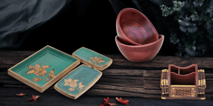 Carved Wooden Trays (Set of 3) + Kettle coaster (set of 6)