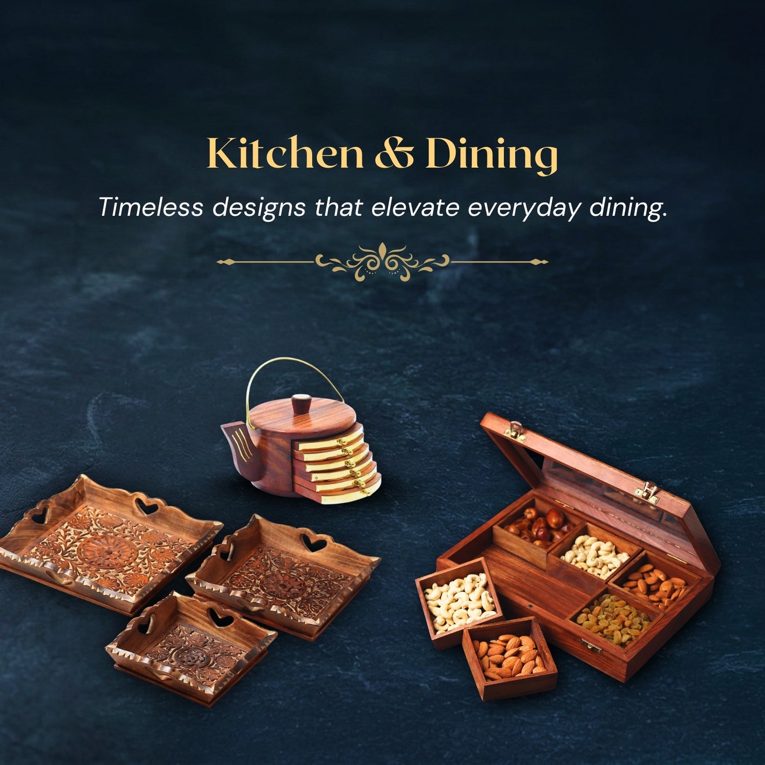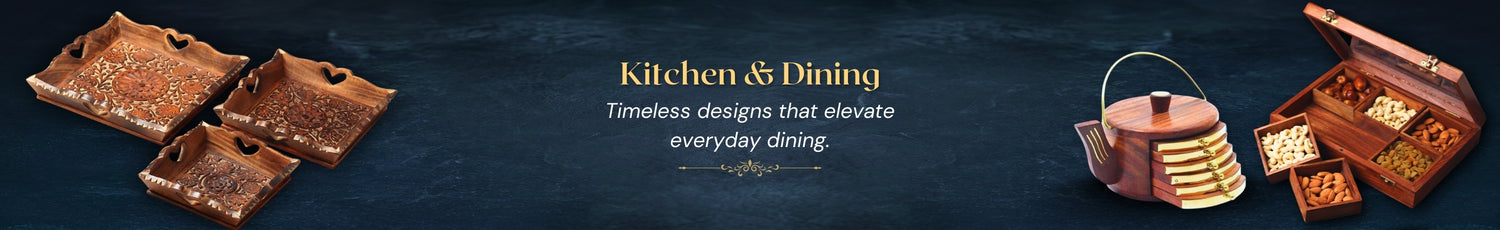 Nothing beats the timeless appeal of wood in the kitchen. Our range of kitchen wooden items includes chopping boards, serving trays, spice boxes, and more—each piece thoughtfully crafted to bring warmth and elegance to your cooking area. Durable, sustainable, and stylish, these wooden essentials are perfect for everyday use and special occasions.
