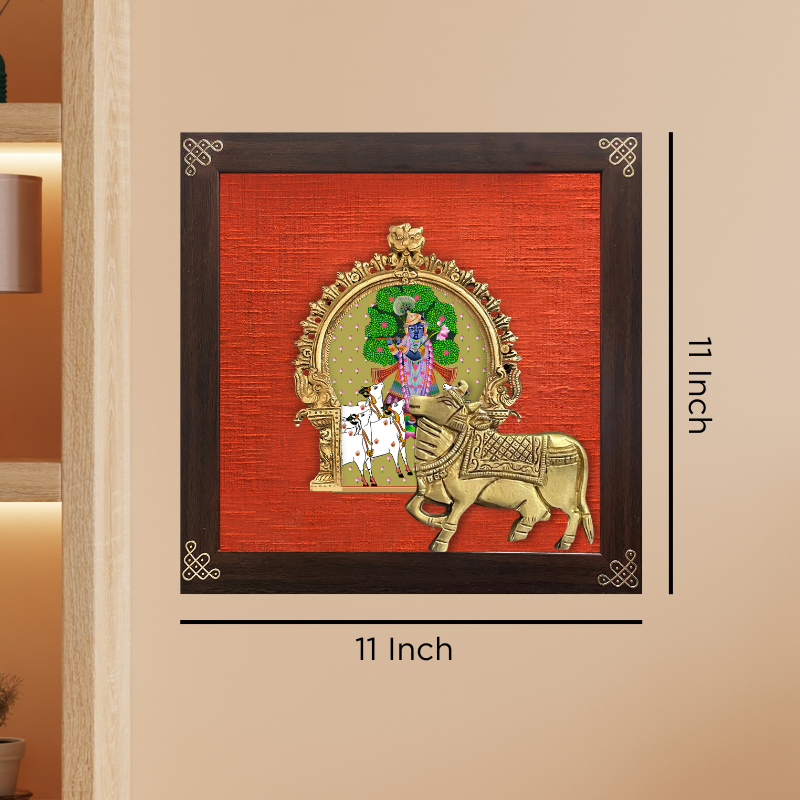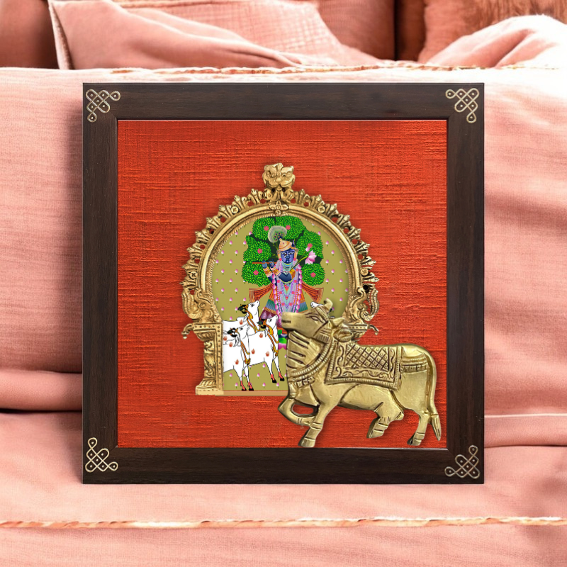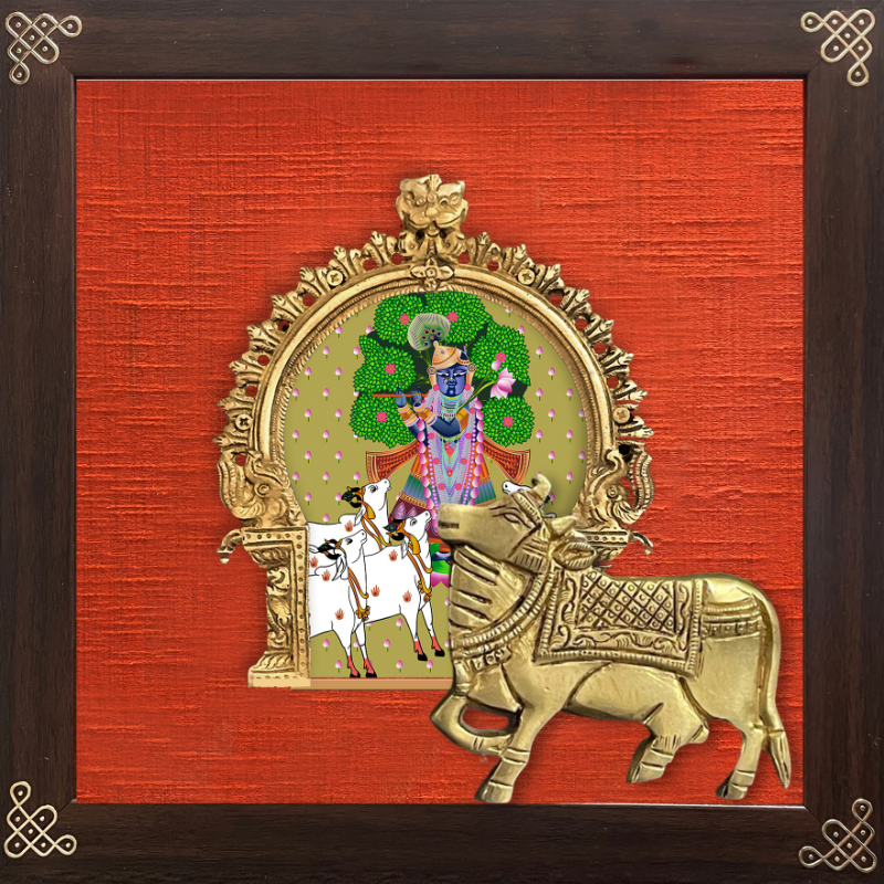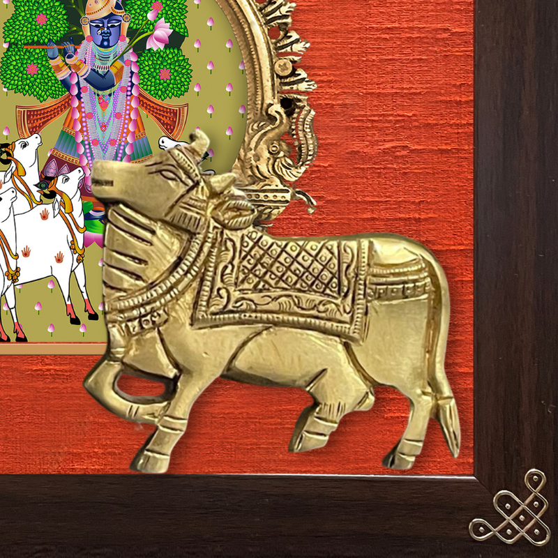 Indian ethnic art digitally printed & embellished with brass prabhavali & brass cow on rich vibrant raw silk & framed with 24 carat gold coated metal kolam borders in the corners.