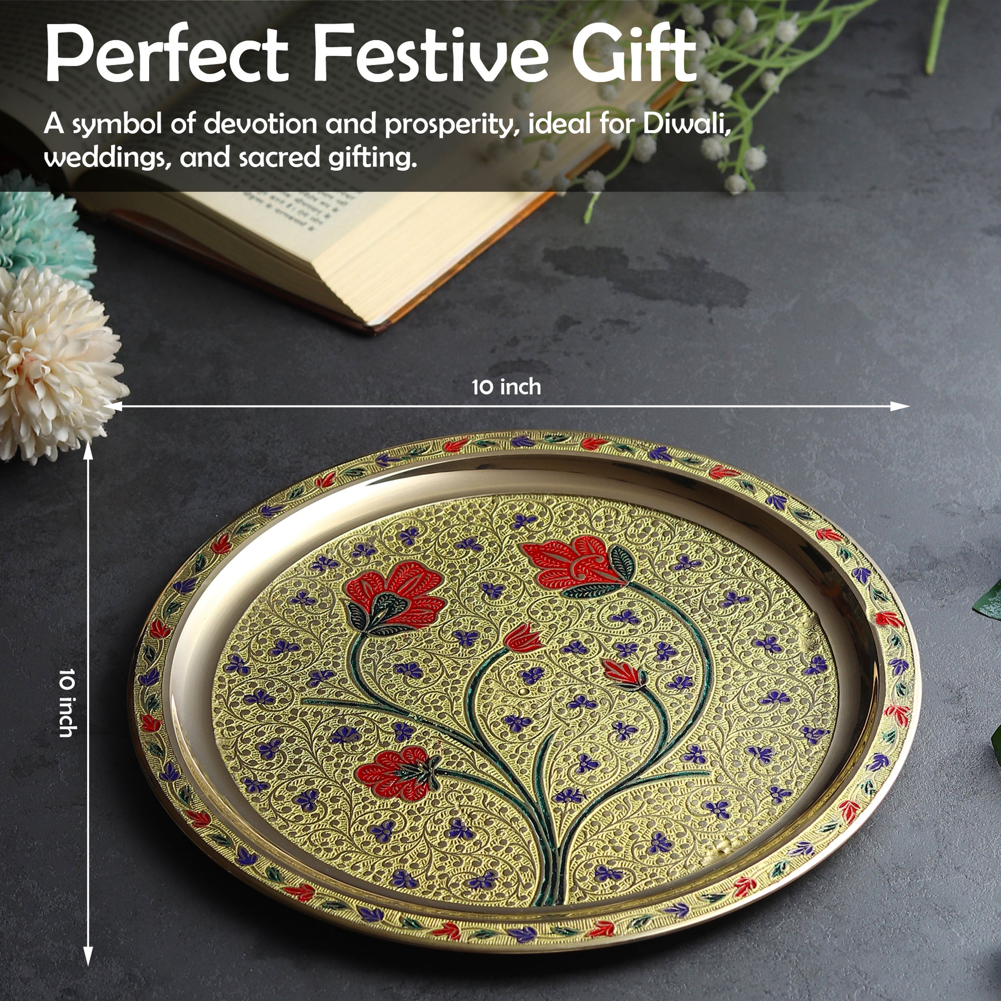 Celebrate your rituals with the brass puja thali set - a perfect harmony of craftsmanship and devotion. Handcrafted with intricate meenakari detailing, this elegant brass pooja thali reflects India’s rich cultural heritage while creating a spiritually uplifting atmosphere.