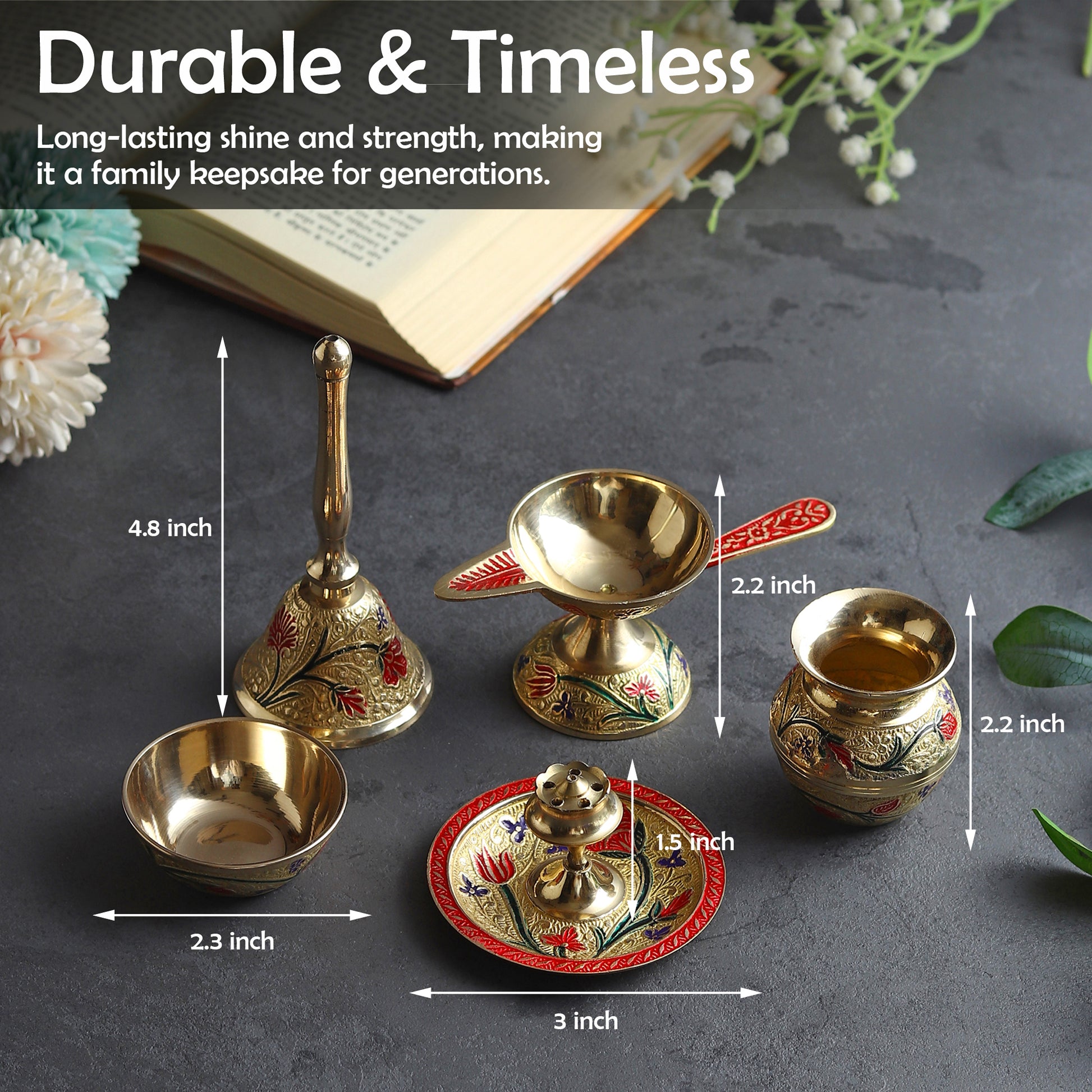 Complete Puja Ensemble: Comes with all essentials - diya, kalash, katori, bell, and spoon - beautifully arranged for a seamless puja experience.