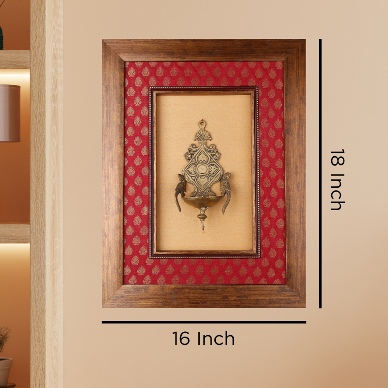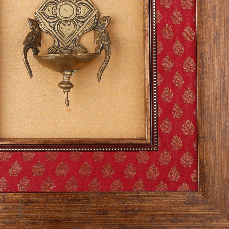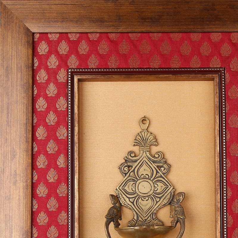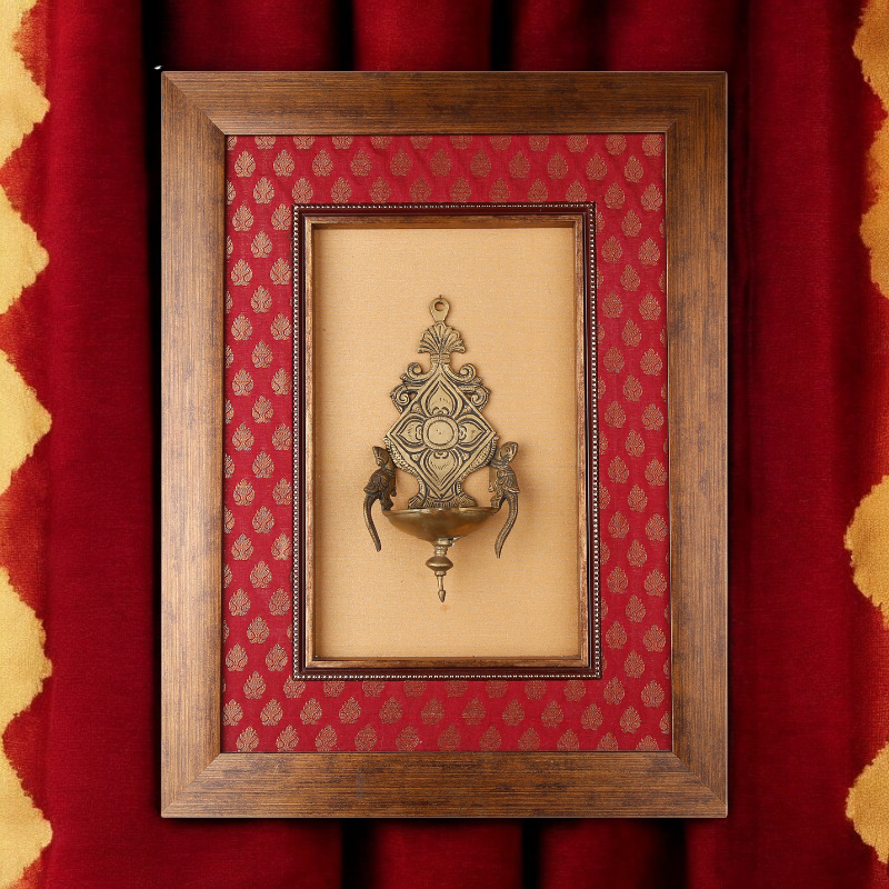 This unique brass diya framed on a rich raw silk & banaras brocade backdrop would fit right into any interior as a beautiful piece of home decor.