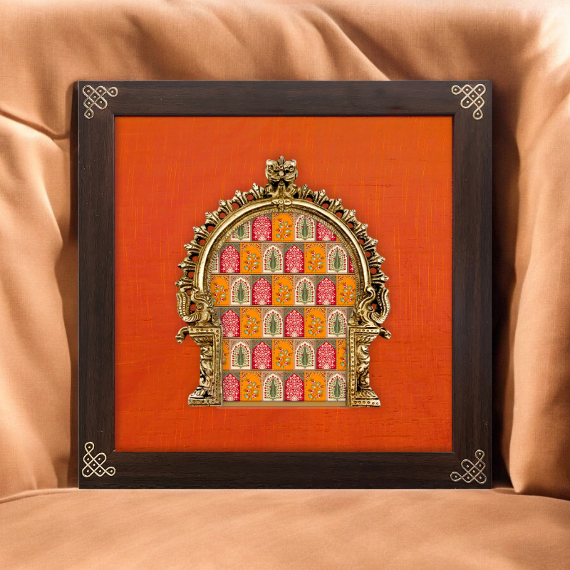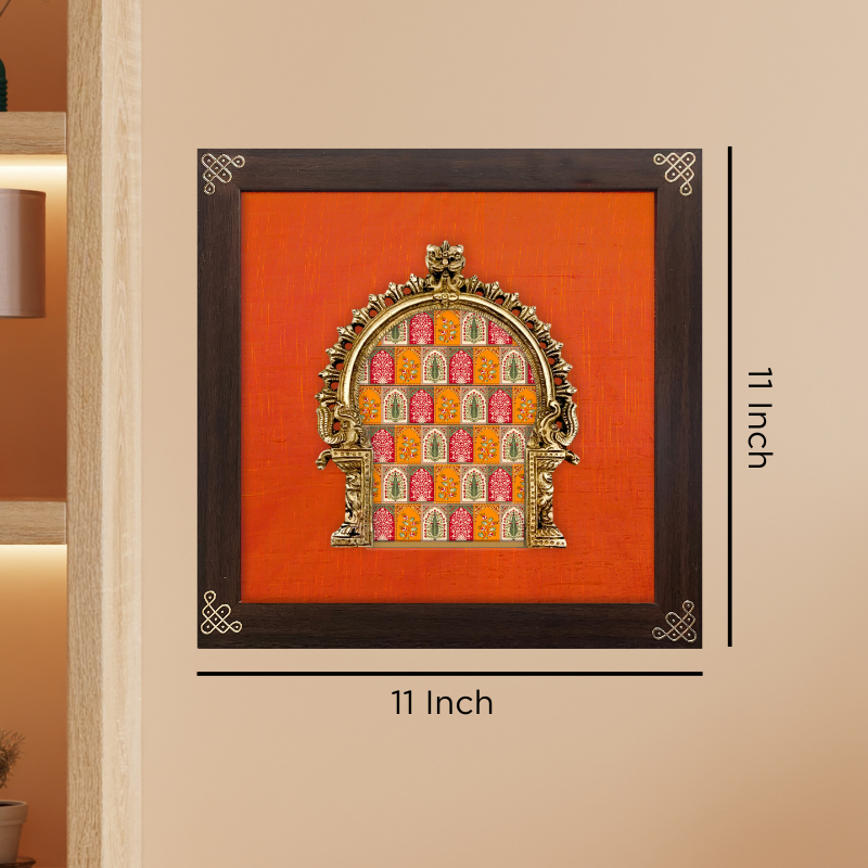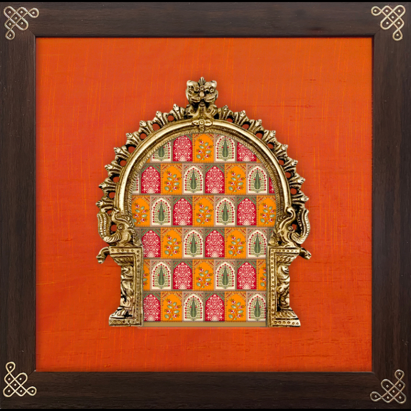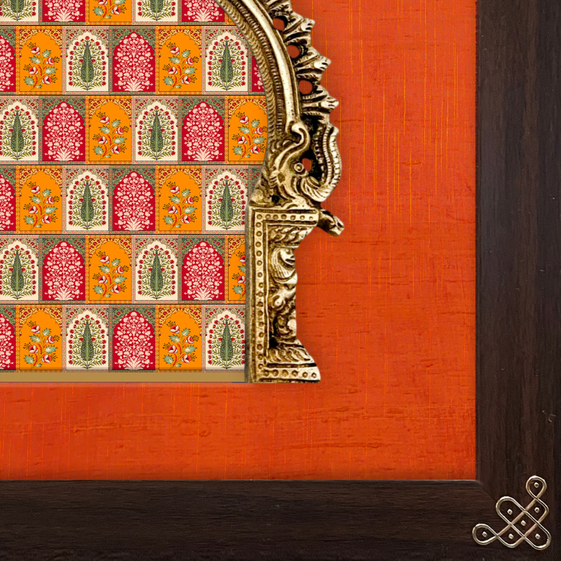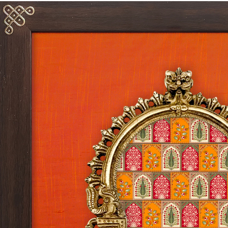 Indian ethnic art digitally printed & embellished with brass prabhavali on rich vibrant raw silk & framed with 24 carat gold coated metal kolam borders in the corners.